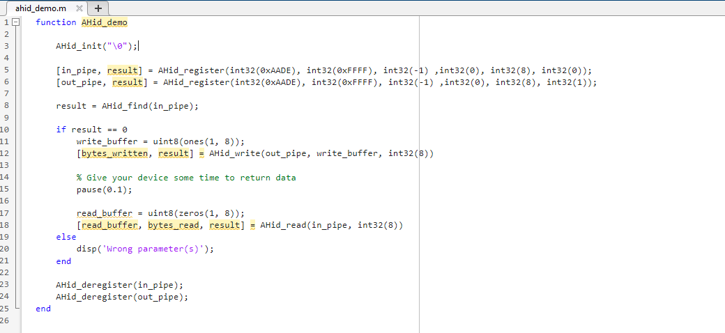 Figure 1: Demo application to send and receive data to/from a HID device using AHid.dll and Matlab.
